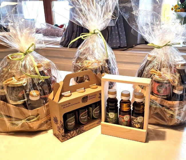 Präsente für Kunden, Mitarbeiter, Vereinsmitglieder oder private Anlässe – mit unserem Geschenkservice machen Sie jedem eine Freude. Wir stellen individuelle Sets aus hochwertigen, regionalen Lebensmitteln zusammen: feine Speiseöle aus eigener Herstellung, passende Delikatessen, ausgewählte Probiersets oder auch ganz spezielle Wünsche.