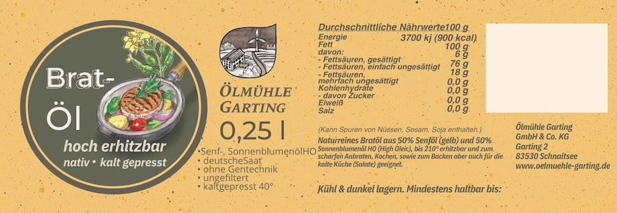 Dieses Bratöl besteht zu gleichen Teilen aus High-Oleic Sonnenblumenöl und Senföl. Die High-Oleic-Sorte zeichnet sich durch einen besonders hohen Anteil an Ölsäure (einfach ungesättigte Fettsäure) aus und enthält deutlich weniger Linolsäure (Omega-6) als herkömmliches Sonnenblumenöl.