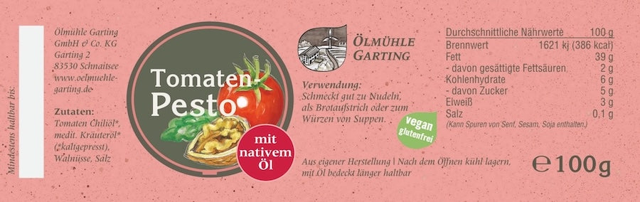 Kaltgepresstes Tomatenpesto von der Ölmühle Garting ist frei von Gluten. Es kann Spuren von Nüssen, Soja, Senf und Sesam enthalten.